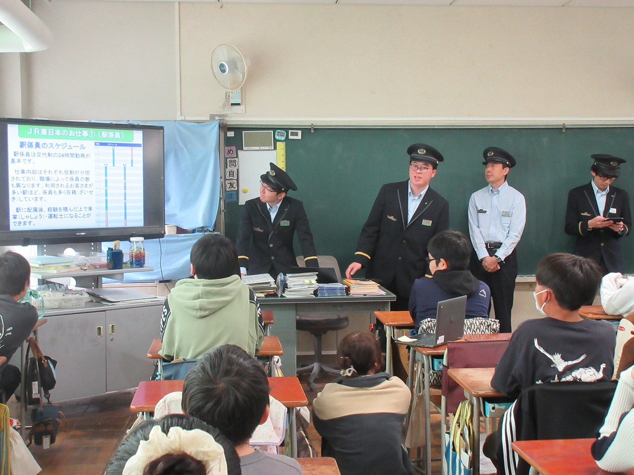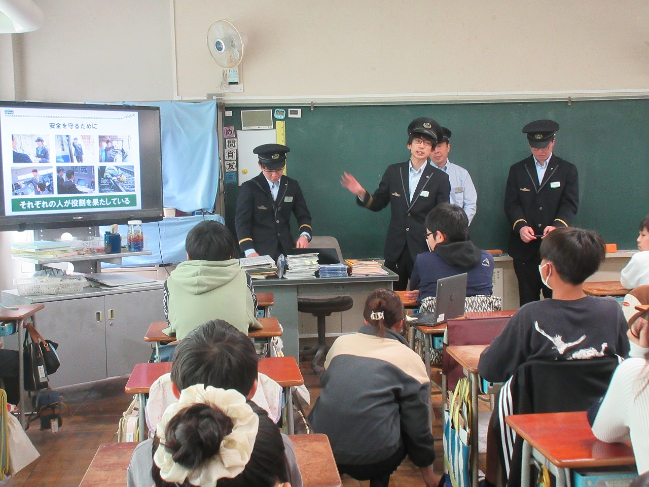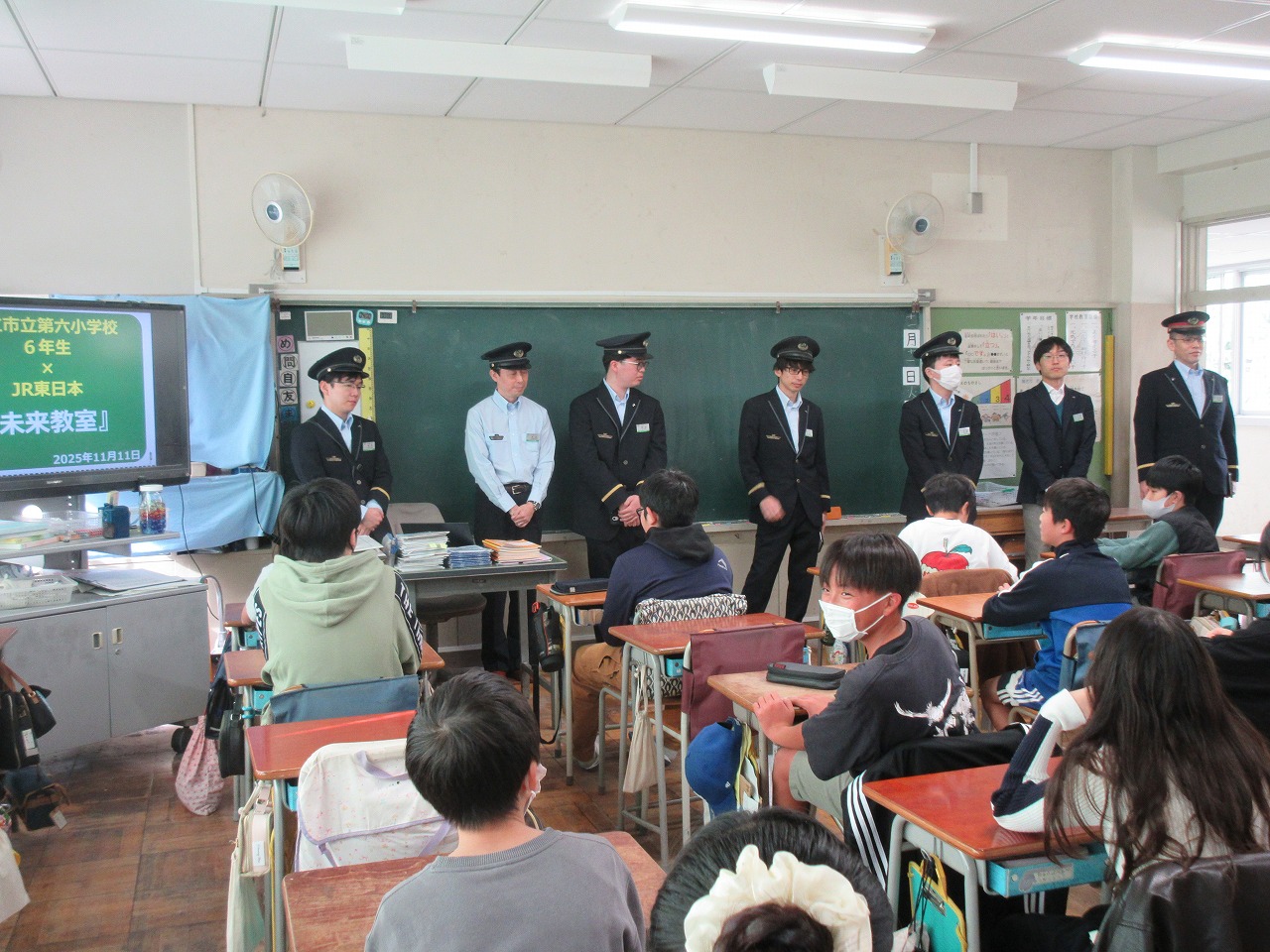 子供たちにも身近な「JR東日本」様。電車のスピードを管理する信号や生活リズムなどを知れ、「聴かないと分からないなぁ。」と呟いていました。「次に電車に乗るときは、帽子を被っていない人や赤い帽子の人を探したい。」と言う様子も見られました。楽しくお話をして下さったので、子供たちも前のめりに話を聞くことができ、自分たちと仕事との関わりを見つけているようでした。