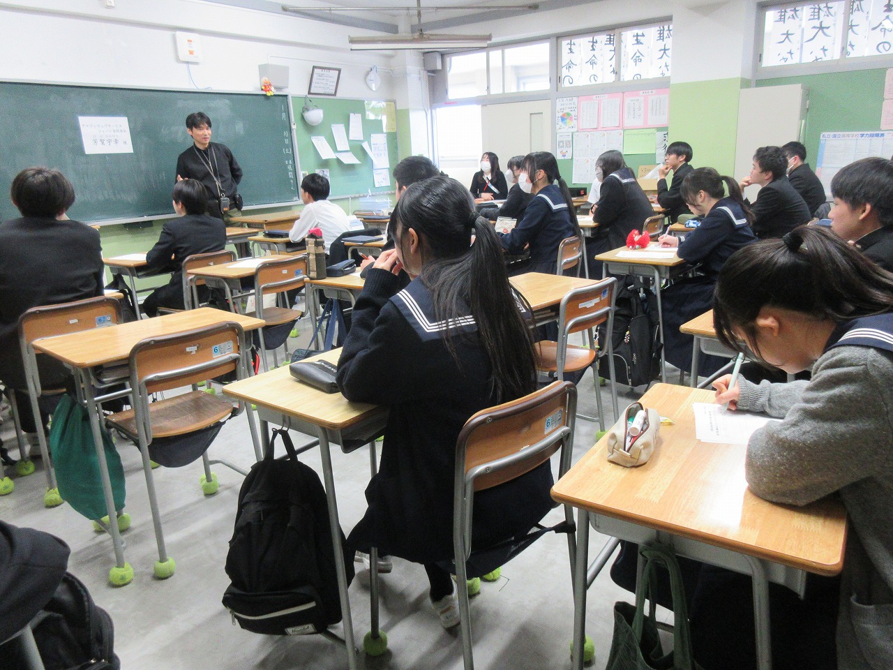 ○本日は貴重なお時間をいただきありがとうございました。「つらい時は成長している時」という言葉がとても印象的でした。子どもたちは今受験直前で気持ちに余裕がない状態の子も多いので、本日のお話を通して、気持ちが楽になったり、希望を持ったりほしいなと感じました。また、人生を24時間で例えられた際も15歳は夜明け前というお言葉でいろいろな目標に向かって計画的に生活してほしいと思いました。私自身残りの人生あと半分か…と少し焦りました。本業だけではなく自分の成長のために副業で高専講師をされているというお話も印象的でした。