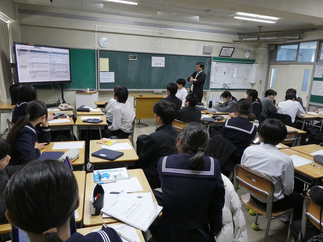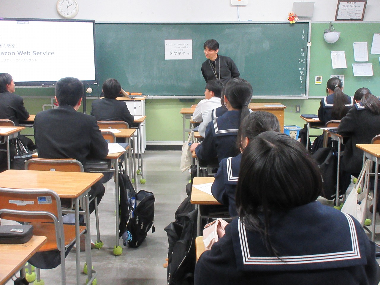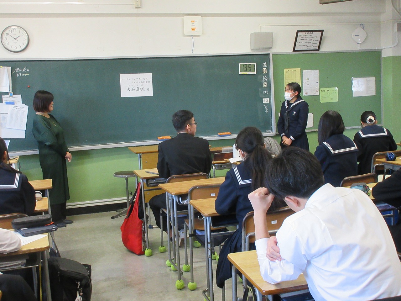 ○終始とても明るく給食後にも関わらず、B組全員が集中して講話を聞けていた。アマゾンという会社のイメージが、運送やサブスクリプションの音楽や動画配信等のイメージが教員、生徒と共に強くありましたが、宇宙開発の内容やキャッシュレススーパー等のお話でアマゾンに対して、新しいイメージを持つことができ、興味がでました。そこから、法律の話に円滑に切り替わり、グループ活動を通じて、身近な法律について学ぶことができました。45分を通じて感じたのは、講話の流れが教員生徒共に非常にわかりやすく、最後まで興味が尽きずに活発に参加することができました。普段、生徒た。普段、生徒の興味・関心を引き出すことを考えながら授業を行っている身としては、明日からの授業改善に活かしていきたいと思いました。ぜひ、来年度も大石さんにご来校いただき貴重なお話を聞かせていただけたらと思います。