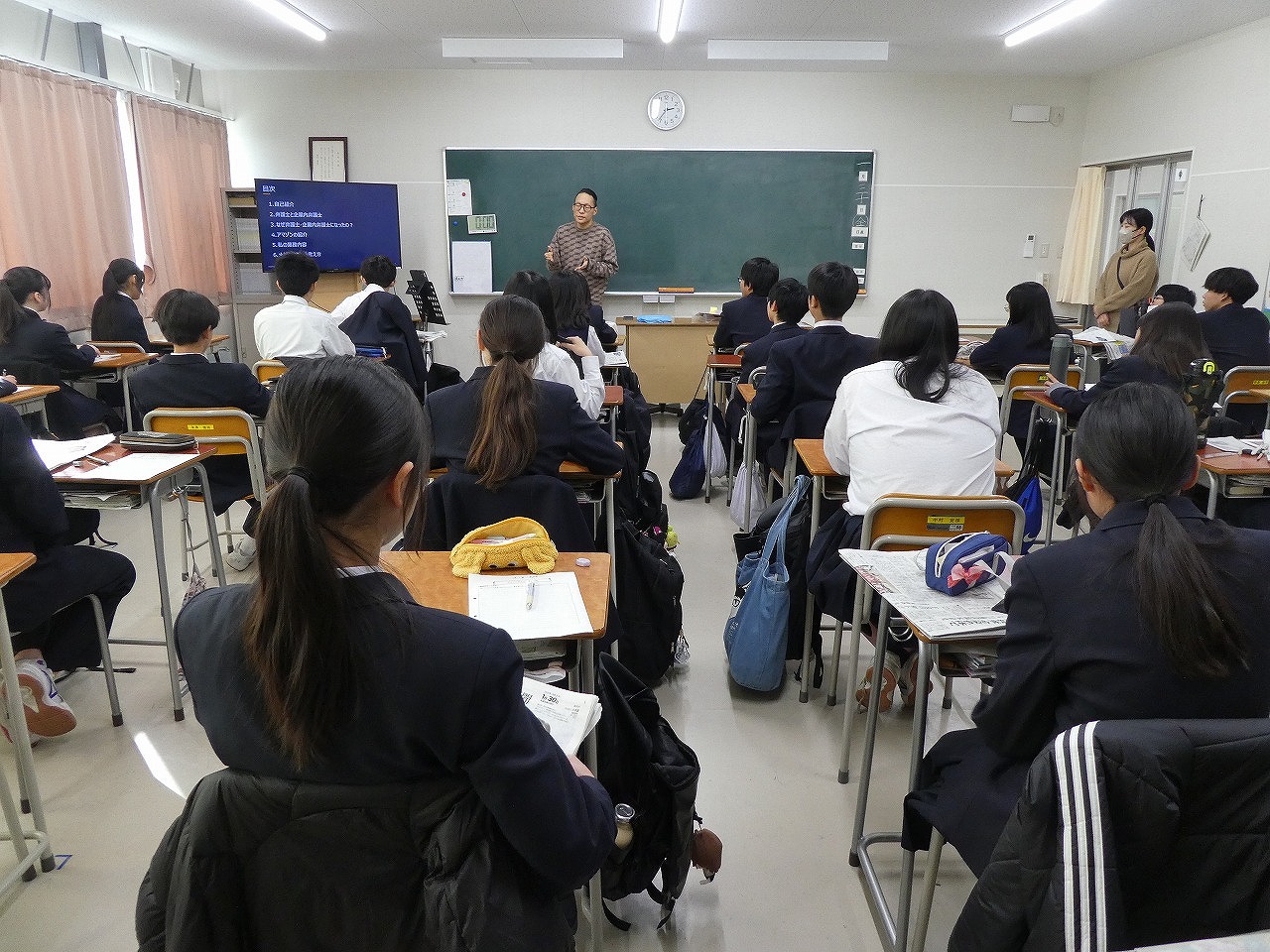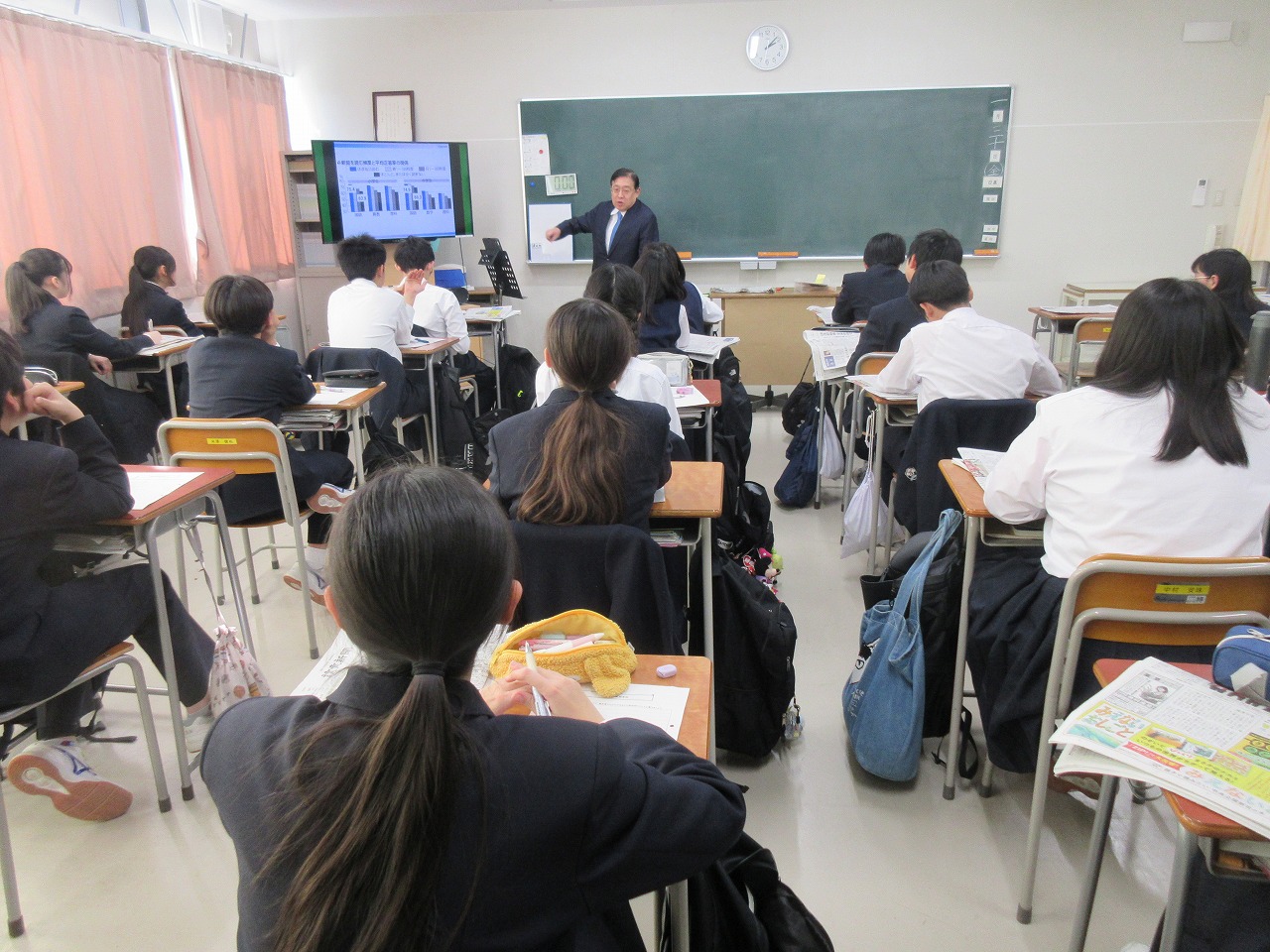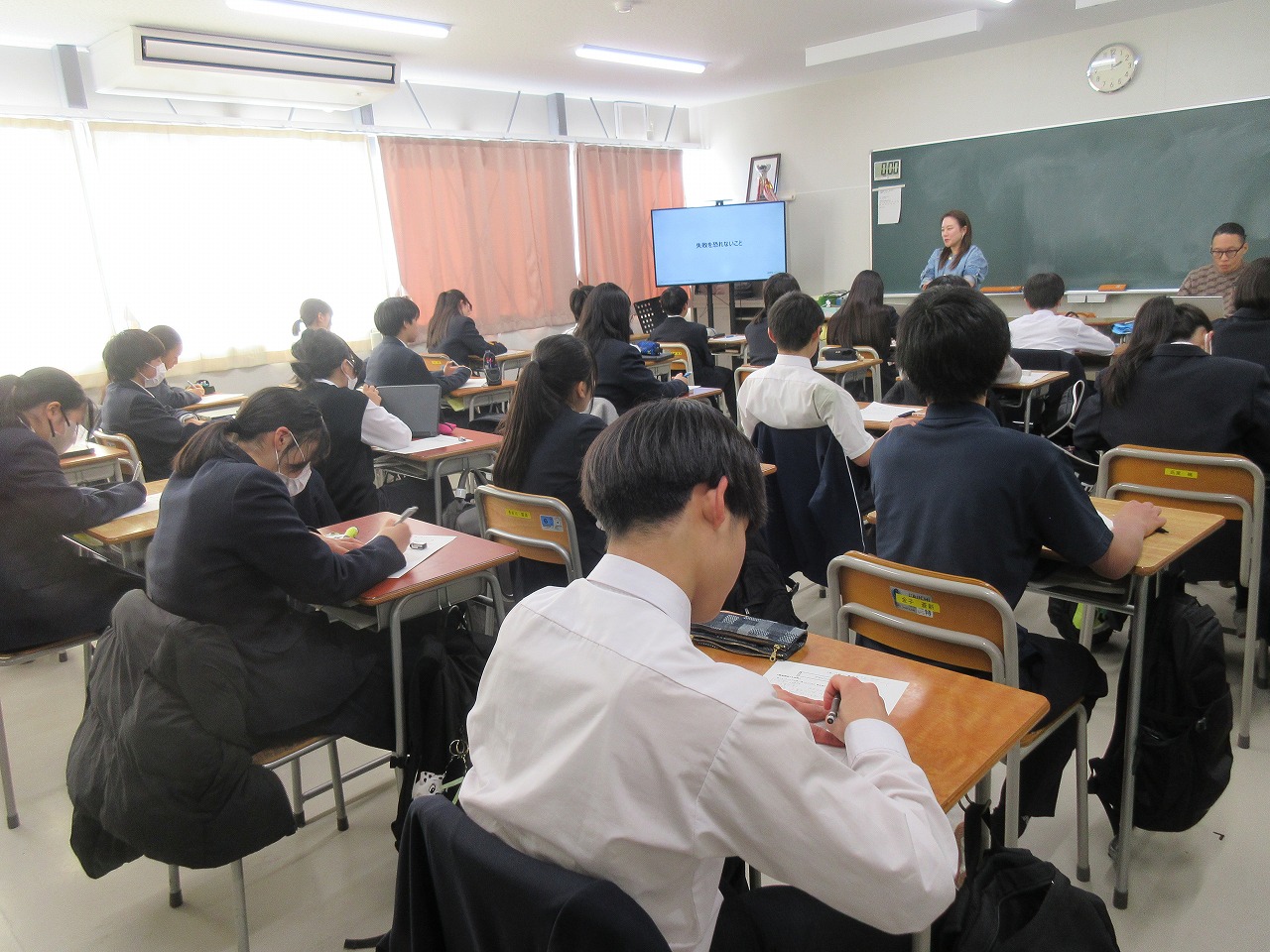 当日は「働くこととは」をテーマに、企業の取り組みや社会的役割に加え、講師の方ご自身のご経験や仕事への思いを交えた大変分かりやすく、心に残るお話をいただきました。スライドを用いた具体的な説明や実体験に基づくお話により、生徒たちは真剣にメモを取りながら耳を傾け、「働くこと」や「将来の自分」について深く考える貴重な学びの時間となりました。